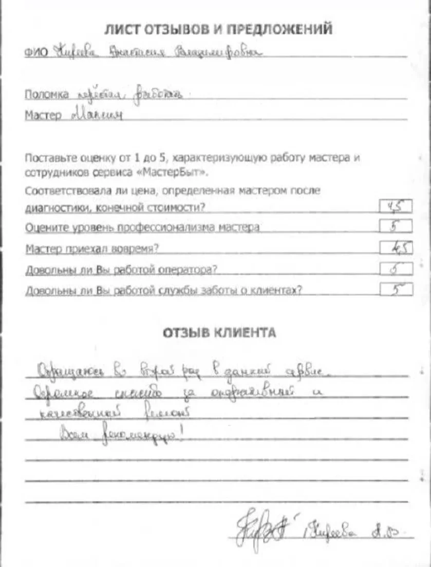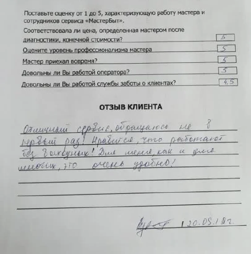 Мы уточним детали и согласуем удобное время для визита мастера